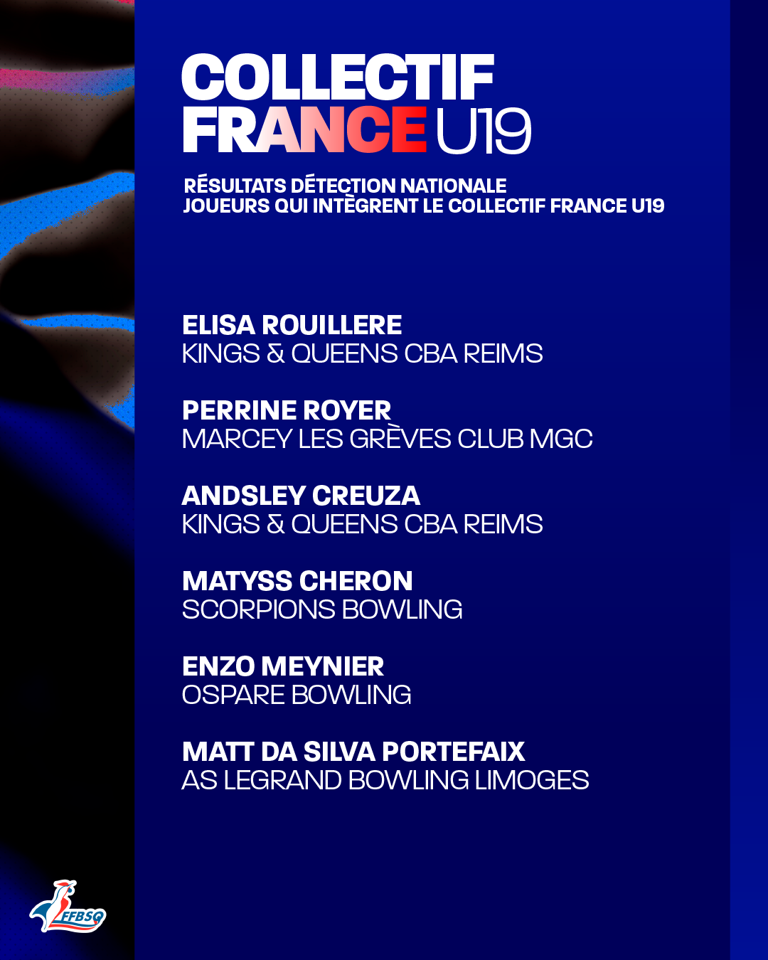 A la suite de la détection et au vu des résultats obtenus, six jeunes ont été sélectionnés pour intégrer le collectif France U19.