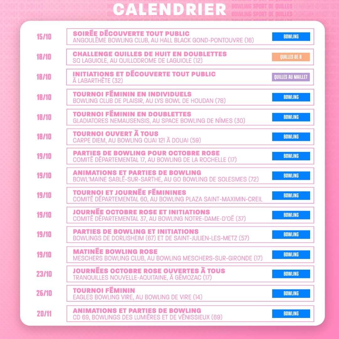Si votre événement n'est pas recensé, merci de nous en informer à comm@ffbsq.org avec le nom de la structure qui organise ainsi que l'adresse, le descriptif et la date de votre événement.